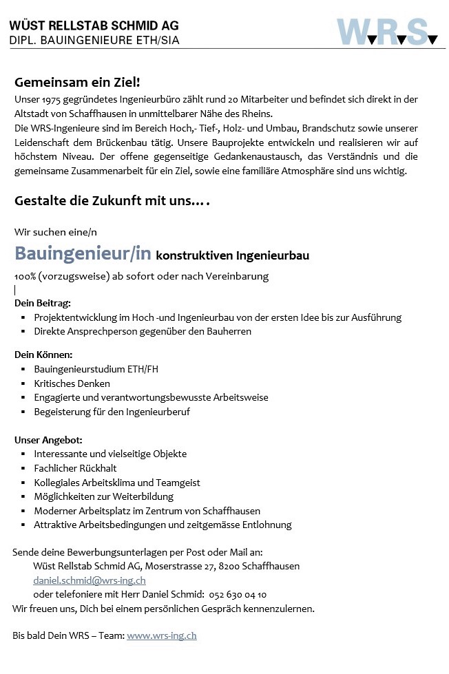 Wüst Rellstab Schmid AG Moserstrasse 27 8200 Schaffhausen Tel.: +41 (0)52 630 04 10 Fax: +41 (0)52 630 04 11 E-Mail: